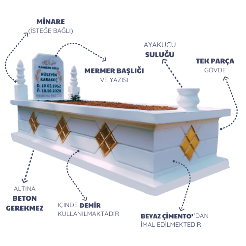 Mozaik mezar, beyaz süper çimento, mozaik taş, 5’lik demir, cam elyaf, mermer tozu, özel kum ve kimyasal karışım kullanılarak üretilen dayanıklı ve estetik bir mezar modelidir. Tek parça üretildiği için ek yeri yoktur ve uzun yıllar sağlamlığını korur.